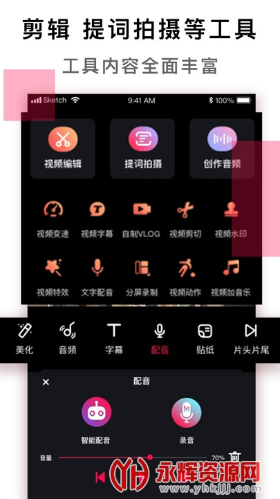 配音达人app是一款专业的短视频配音软件。它的功能非常强大,不仅支持给短视频配音,同时还能对视频进行编辑。用户可以任意的选择喜欢的短视频进行配音,并制作出自己专属的短视频!想成为配音达人吗?想制作出自己配音的专属视频吗?那就来永辉资源网下载体验吧!