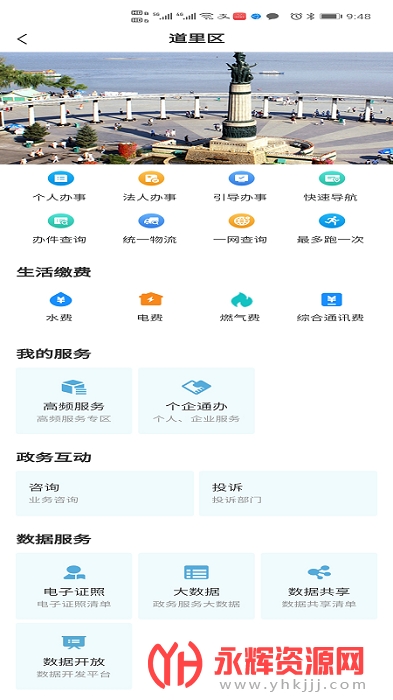 设置政务服务、利企服务、便民服务、生活缴费和数据服务等快捷办事入口,实现应用快速启动。
