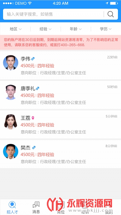 温州人力资源网招聘app是一款非常优质的求职找工作软件,软件中有着海量优质的岗位信息,你可以找到适合自己的工作,快来永辉资源网下载吧!