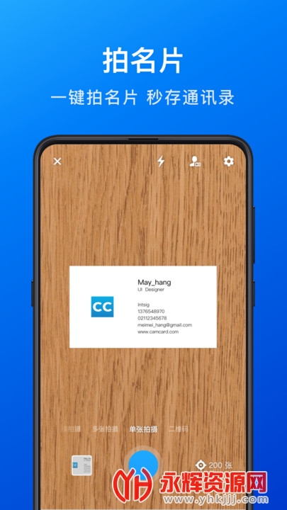 用名片全能王,手机拍照,就能自动扫描,精准识别名片上的信息,快速保存到手机通讯录。