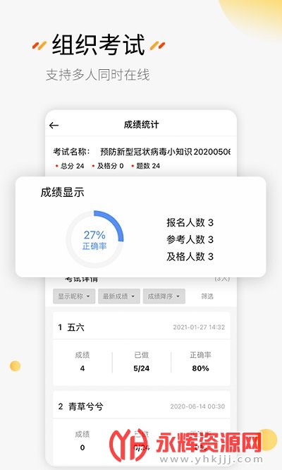 组织者可以使用刷题神器内置的发起考试功能,轻松组织小规模考试,参考人员不需要下载刷题神器APP,直接使用微信小程序参与考试.考试组织者也可随时查看参考人员的答题情况.