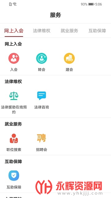 功能模块包含网上入会、法律维权、技能培训、职工书屋、就业服务、互助保障、学习社区等.