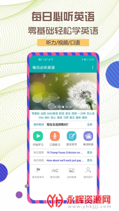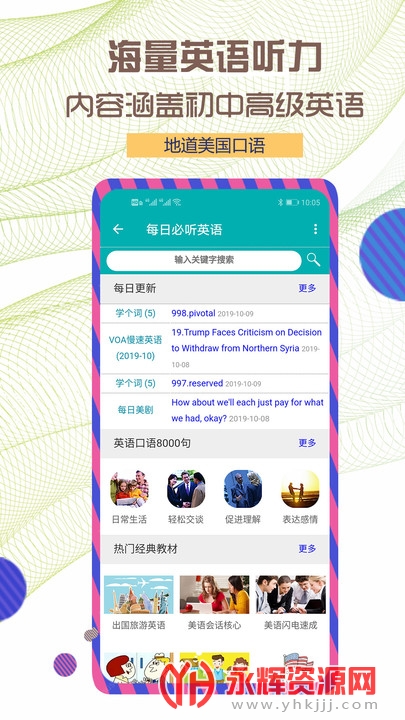 每日必听英语app是一款非常好用的英语学习软件,这款软件主打英语听力学习,涵盖了大量的英语口语和词汇,能够很好的锻炼大家的英语听力能力,用户可以随时随地在线收听学习,并且还有着强大的实时翻译功能,帮助你更好的听懂理解!有效的提高英语成绩!感兴趣的朋友们就来永辉资源网下载吧!