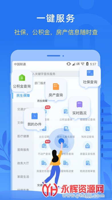 个人服务:提供社保账户信息、就医健康档案、不动产登记信息、身份证、驾驶证、行驶证等电子证照等个人数据查询.