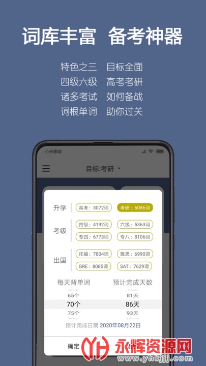 只需要设置目标并开始,本软件会依据算法随时进行巩固复习。