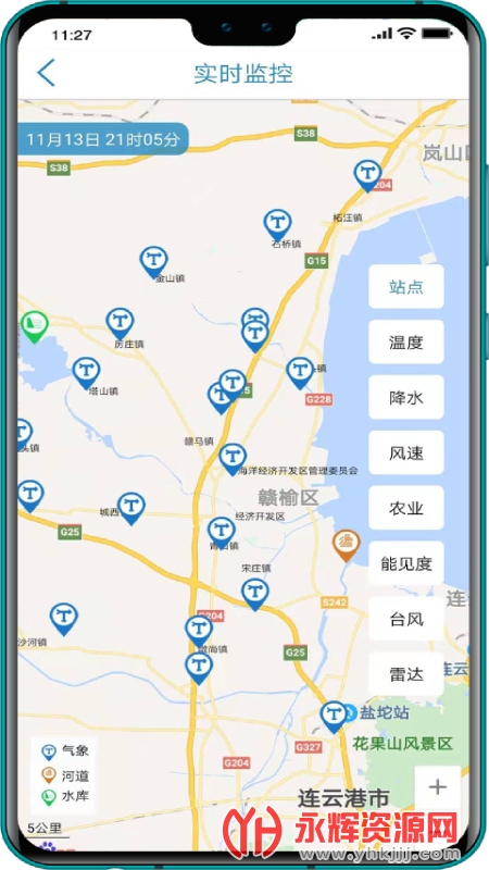 2、立即点击气象图标并选择气象站点,查看地图上站点信息