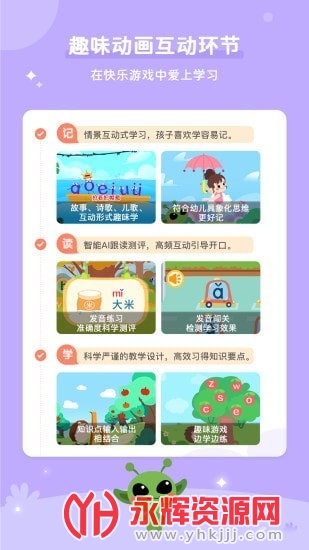 1、针对3-8岁幼儿年龄特点,动画交互体验,游戏化学习流程;