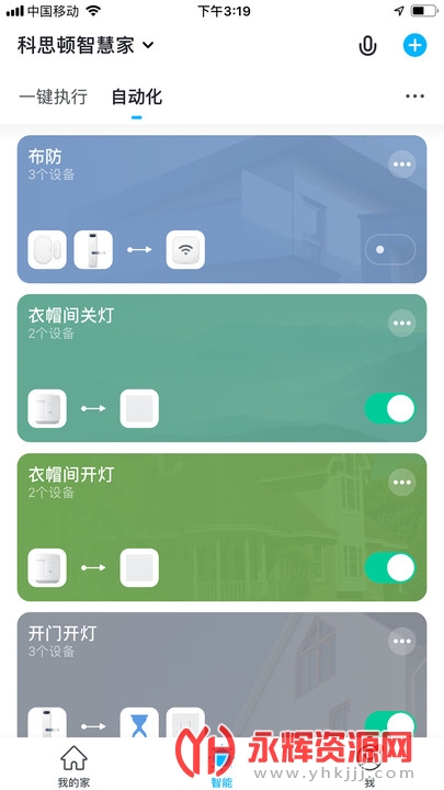可根据用户的需求,灵活配置,自定义场景, 例如:离家场景 自动关闭灯光空调等电器。