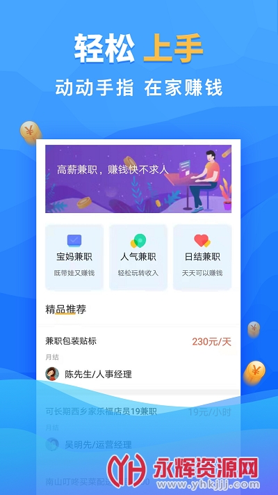 来赚兼职app是一款非常靠谱的兼职赚钱平台,软件中有着超多优质的兼职工作,你可以利用软件找到满意的赚取外快,有需要的朋友们快来永辉资源网下载吧!