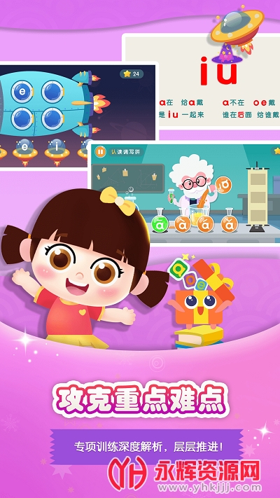 学龄前儿童拼音学习软件,提供丰富动画课程,画面生动,互动学习,边学边训练,更快掌握所学知识,全面提升孩子的听、读、拼、写能力。