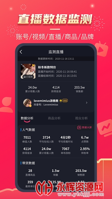 抖查查直播观测台是一款非常好用的直播数据分析手机软件,软件专门为从事现在非常流行的直播带货行业的朋友打造了一个功能全面的直播带货数据分析平台,帮助用户能够运用数据技巧就能获得流量变现,专业的分析,还能帮你找品牌达人招商直播短视频资源对接,有需要的朋友就快来永辉下载体验吧!