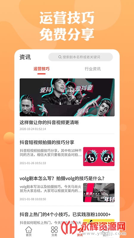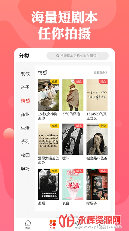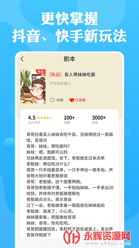 快抖剧本app是为广大短视频创作者提供的辅助软件,这款软件中有着多种拍摄剧本,你可以进行参考借鉴,有需要的朋友们快来永辉资源网下载使用吧!