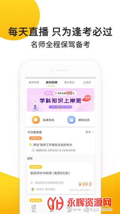 易师考app是一款专为教师考证打造的学习软件,软件提供了海量的知识内容,专业的直播课程,还有海量的题库等等,帮助大家轻松的在线学习,随时随地都能在线学习,非常的方便快捷,助力大家轻松通过考试!有需要的朋友们快来下载吧!