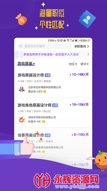 勇者直聘app是一款非常不错的掌上求职招聘生活服务手机软件,软件凭借了强大的互联网技术为用户打造了一个功能全面的线上求职平台,在这里为用户提供了非常多的工作可以挑选,有需要的朋友就快来永辉下载体验吧!