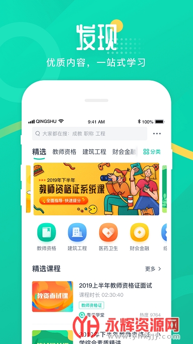 教师资格证模块:提供教师资格证幼儿和小学课程,包含完整的笔试面试内容,智能音频推送,充分利用碎片化时间。