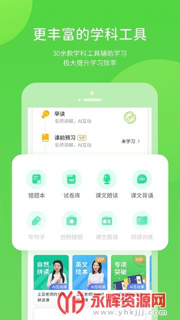 课本点读、练口语、作业辅导、绘本课程、考试测评、早读课程、课前预习、课后巩固、阅读训练、语法训练、听力训练、每日英语、老师作业、丢分题、精选收藏、听力、欧美课程、学习工具、乐配音、乐配音测评、词典、单词听写