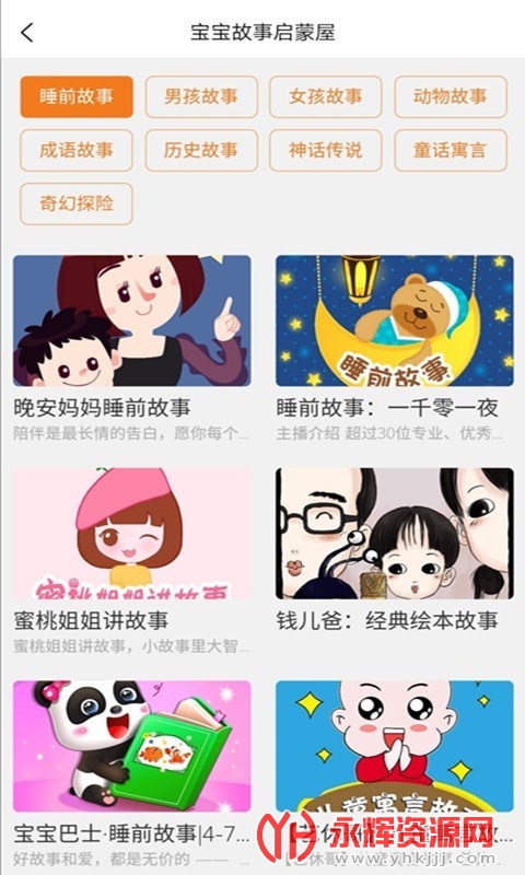 [故事]:故事种类多,有男孩故事,女孩故事,神话故事,成语故事,历史故事等。故事有语音播放,宝宝开心,家长省心。