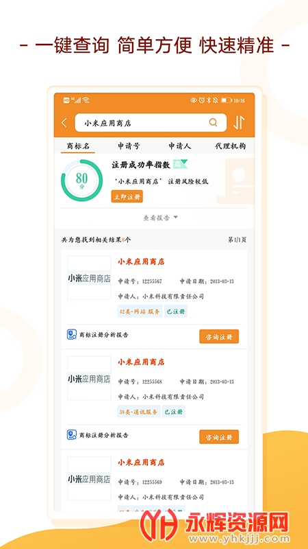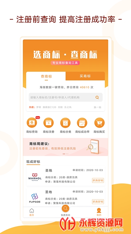 商标注册查询app全新更好的为广大用户提供带来的无广告插件的商标注册查询应用工具,用户使用这款软件就可以通过入商标名、注册号及申请人名字即可查询商标注册状态,有需求的朋友快来下下载体验吧!