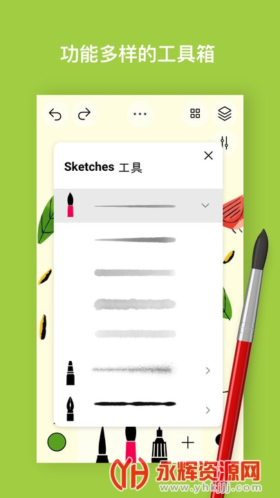 - Sketches 的笔刷设计,让您在绘图时下的每一笔都像在真的纸上,笔触会随着下笔轻重、倾斜度和速度而改变。