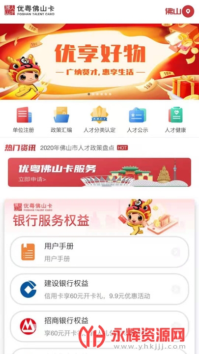 优粤佛山卡app是一款人才服务软件,专为佛山本地用户打造,为用户提供了优粤佛山卡在线申请领取以及人才资讯推送等综合服务。为佛山用户提供了一站式的人才扶持服务,给与本地人才更多的福利和帮助!如果你符合条件的话,不妨注册一个,利用上面提供的各种优惠,为自己谋取更多的福利!有需要的朋友们快来下载吧!