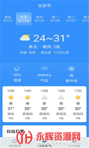 1、未来5天的每天天气详情,包括风力风向、湿度、气压、紫外线强度、日出时间、日落时间等。