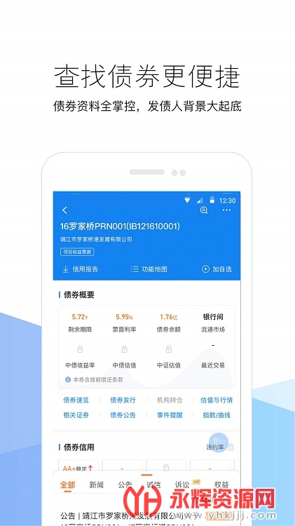 展示债券的详情信息,包括债券要素、债券发行、债券评级、债券估值、事件提醒、债券公告、相关证券、机构持仓等内容。