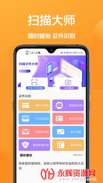 3、身份证、银行卡、驾驶证、营业执照拍快速提取内容!自动切边去杂乱背景,人像可进行自动美化。