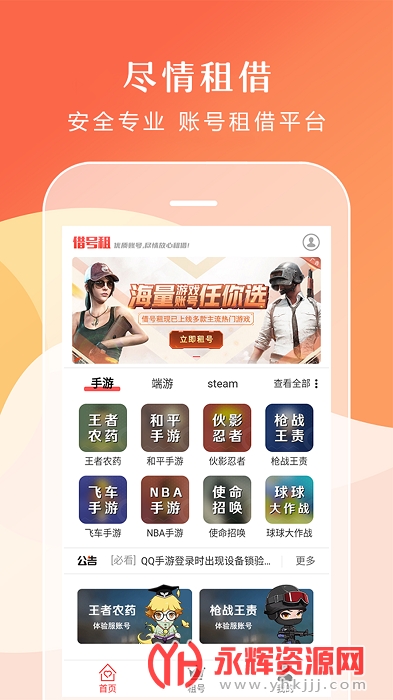 借号租APP,一个高端游戏账号租赁服务平台,涵盖热门的手游、端游、Steam等人气游戏,致力于给玩家体验土豪、高端账号的快乐!