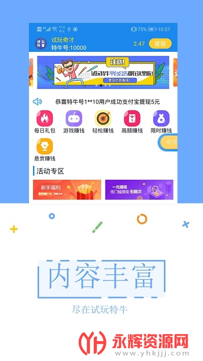 试玩特牛app是一款非常可靠的手机赚钱平台,软件中有着多种试玩赚钱任务,都是明码标价的,你只需要完成任务就能赚取佣金,有喜欢的朋友们快来永辉资源网下载吧!