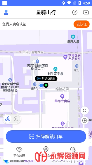 星骑出行用户端,本应用主要提供给车辆租赁的用户使用,提供我的账户,常见问题以及系统设置模块。用户可以在首页进行扫码解锁用车,搜索目的地还车点,切换显示车辆位置和停车点位置,定位自己的位置,以及联系客服。