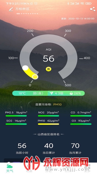 山西空气质量app全新为用户满足的空气质量和天气预报服务应用平台,这款山西空气质量发布app能够帮助用户轻松的查询当空气中的质量,室外温度、湿度、能见度、紫外线等,有需求的朋友赶快前来下载体验吧!