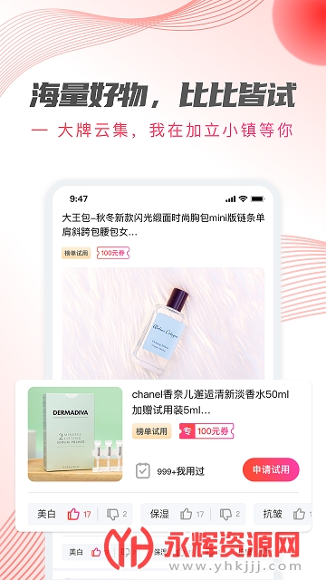 这是一款专门提供高价值免费试用商品的APP,专业的试客分享平台.每天上万件高价值商品提供免费试用,汇集淘宝、天猫、京东各大平台最新最热试用,商品丰富,品类齐全,试用商品收到无需返还,仅需对商品进行客观评价.高通过率,低门槛,手机APP随时随地轻松申请!