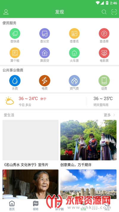 爱休宁app是为当地朋友们打造的融媒体服务软件,软件的功能涵盖十分全面,能给你提供查公交、生活缴费、查违章、算房贷等一系列功能,有需要的朋友们快来永辉资源网下载使用吧!
