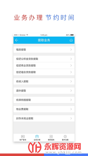 业务办理模块提供提取预约与退休提取业务和公积金计算与网点查询等服务;