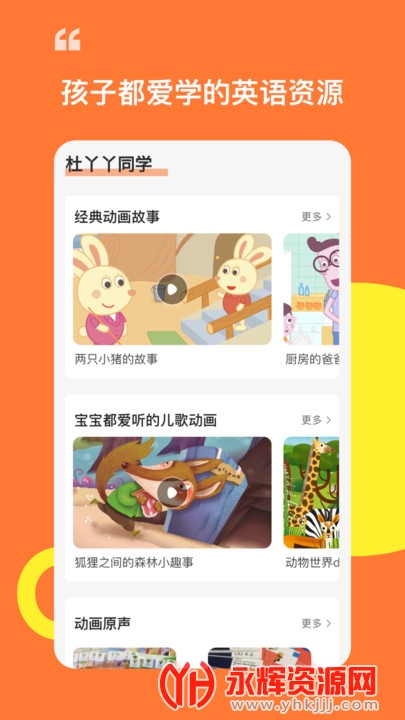 杜丫丫同学app是一款专为广大儿童打造的英语学习软件,软件上有着丰富的学习课程,和海量的学习资源,可以满足用户的各种学习需求,同时还有着大量有趣的经典动画故事和儿歌等,打造了一个有趣的学习氛围,能够让孩子们愉快的学习英语,更加有效的学习!感兴趣的朋友们快来下载体验吧!