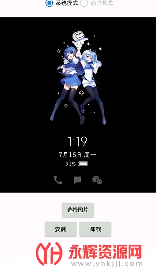 在自定义操作界面,用户可自由上传图片、设置文字颜色、设置图片位置,然后还可以开启显示电量、显示通知,项目设置完成后点击“应用”即可。操作很简单,而且选项很人性化,支持静态图与GIF动图。