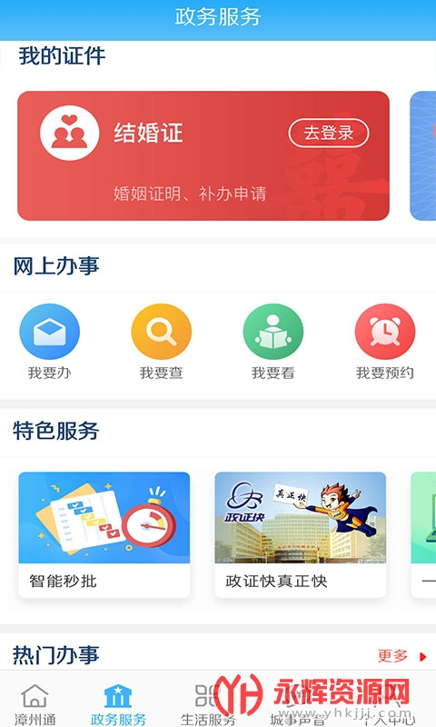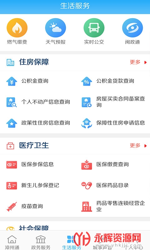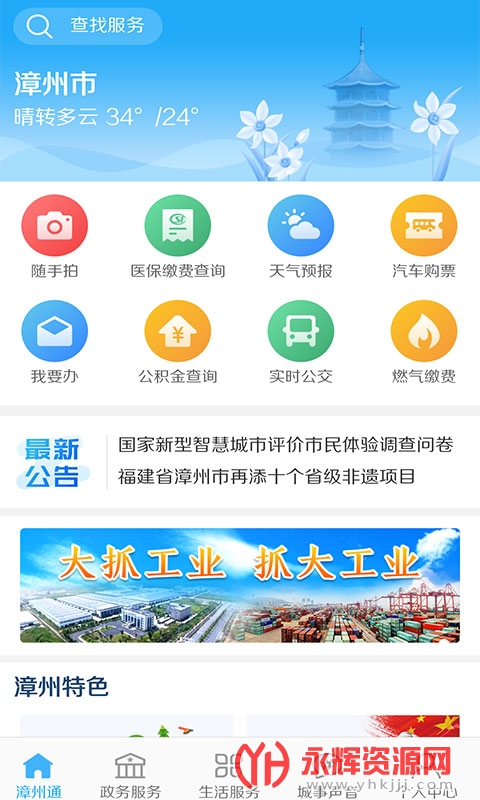 “漳州通”APP包涵公众资讯服务中心、网上办事中心、政民互动中心、生活服务中心四大版块,为公众提供各类资讯、网上办事、政民互动、生活服务,为群众提供一站式服务。