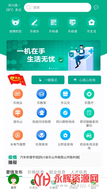 云就业服务。接入乐山市人才网和农民工服务网,提供海量招聘信息,开展线上招聘、应聘,满足公众就业需求。