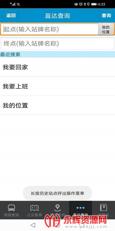 6、在公交换乘界面,市民可选择出发点与目的地,查询车辆转乘信息。