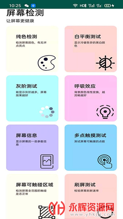 屏幕检测专家app是一款非常实用的手机工具软件,这款软件可以帮助用户检测自己的手机屏幕,软件的功能十分强大,可以查看各种详细的屏幕信息,涵盖了屏幕颜色、白平衡测试和灰阶测试等等,随时随地都能进行测试,实时了解自己手机的屏幕情况!欢迎有需要的朋友们前来永辉资源网下载!