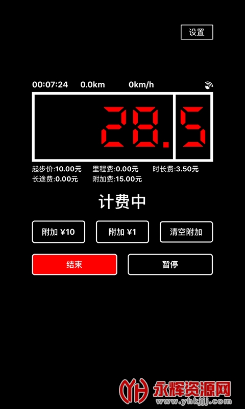 【简单好用】模仿传统的出租车打表器,同时附加总里程数、总耗时,当前速度,及各费用明细等信息,界面简洁实用,一目了然。