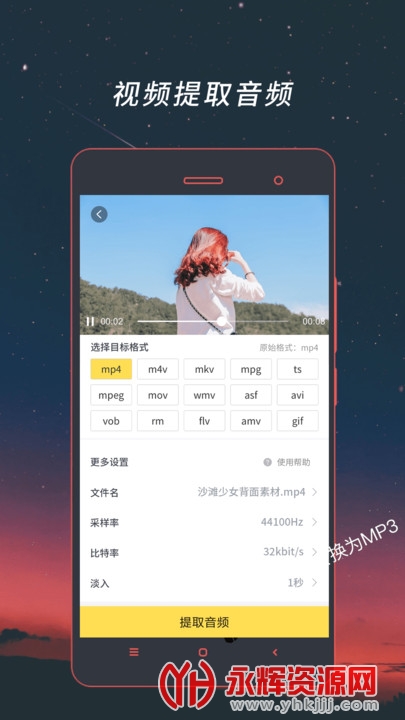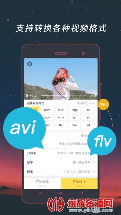 视频格式转换器app是一款非常实用的视频格式转换工具,支持一键转换视频格式,并且支持多种视频格式转换,非常的方便好用,还可以将转换的视频一键保存到手机上,可以随时观看。欢迎感兴趣的朋友们前来永辉资源网下载!