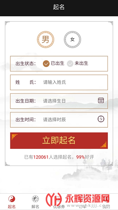 千千起名app是一款非常优质的手机起名软件,使用软件为根据宝宝的生辰八字定制一个有寓意的名字,快来永辉资源网下载使用吧!