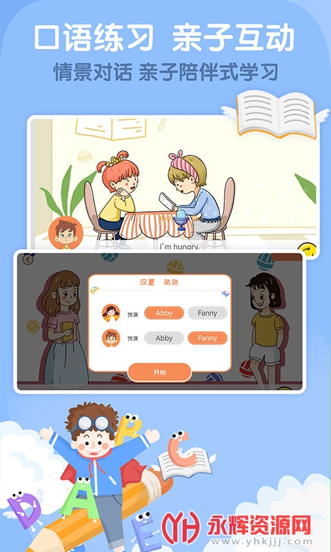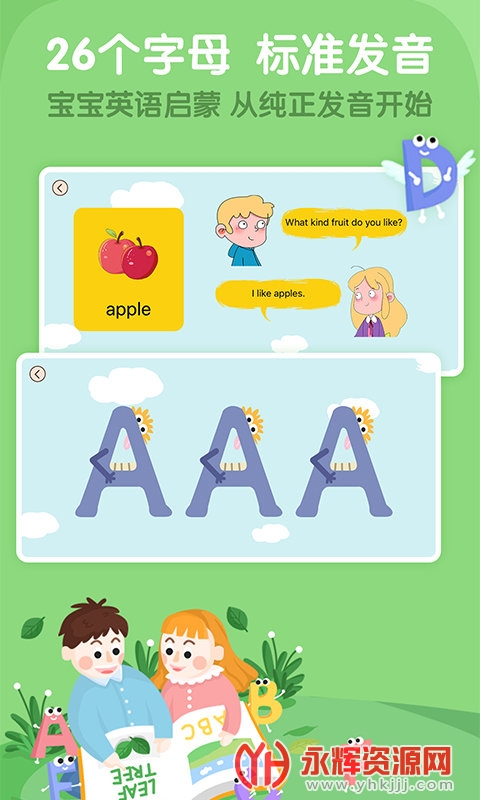 字母入门,词汇拓展,单词短句,视听素材,绘本读物,睡前故事,亲子情景对话一应俱全,多方位提升孩子听说能力。