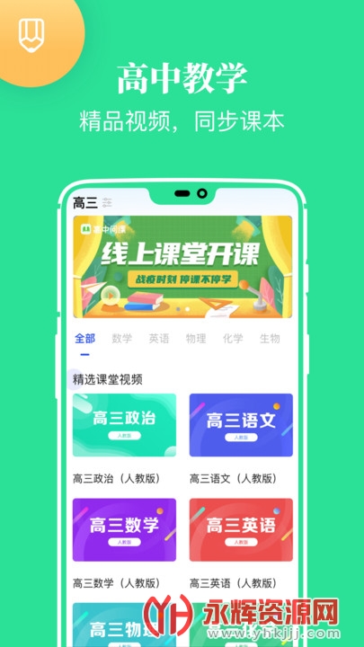 高中课学习app是一款非常好用的高中学习软件,这款软件拥有海量的学习知识内容,涵盖了小初高语文数学英语等各科目,并且与教材同步,可以帮助学生们更好的进行学习,可以在课前进行预习,课后及时的复习,让学习更加高效,能够快速的提高学习成绩!欢迎感兴趣的朋友们前来永辉资源网下载!