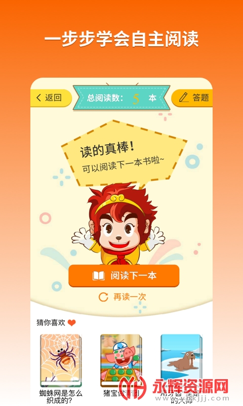 悟空阅读专业版app是一款专门为孩子打造的阅读学习软件,该软件为每位孩子提供优质的阅读服务,如果您的孩子还在学习识字,可以接触接触各种读本,在识字的同时还能增长知识储备,拓展学习的内容,其中的故事往往最能激发孩子的学习兴趣,有需要的朋友现在就来下载使用吧!