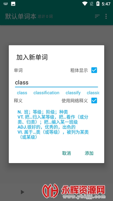 简单词本app是一款非常好用的记单词,学单词软件,用户可以任意的添加各种英语单词到单词本里,方便随时进行记忆,遇到不会的生词也可以添加进来,软件会给出详细的单词释义,用法和发音,帮助大家轻松的学习单词,掌握单词的用法和发音,能够快速的学习单词,提升英语水平!欢迎感兴趣的朋友们前来永辉资源网下载!
