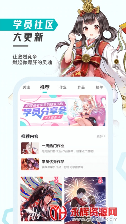 轻微课是专业的绘画在线学习平台与工具,不管都是手绘、动漫板绘、CG插画、漫画创作、游戏原画设计还是传统美术中的水彩、彩铅、简笔画都一应俱全,一站式解决学画画的难题,学绘画的APP这一款就够了!