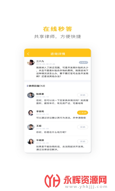 律师速回app是一款非常专业的法律咨询服务软件,在这款软件中你可以寻找专业律师咨询法律相关问题,有需要的朋友们快来永辉资源网下载吧!