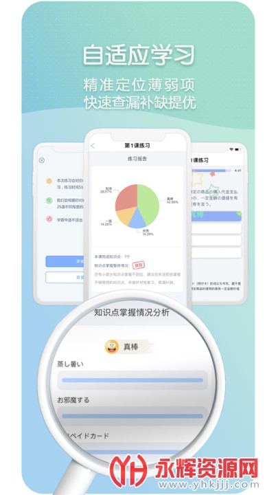 自适应练习可精准定位学生所处日语级别,为学生规划适合学生学习的有效路径,从而让学生在避免题海战术的同时,快速有效的提高日语学习成绩和日语高考分数。